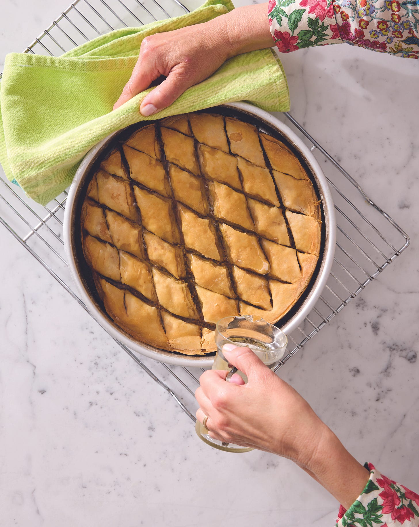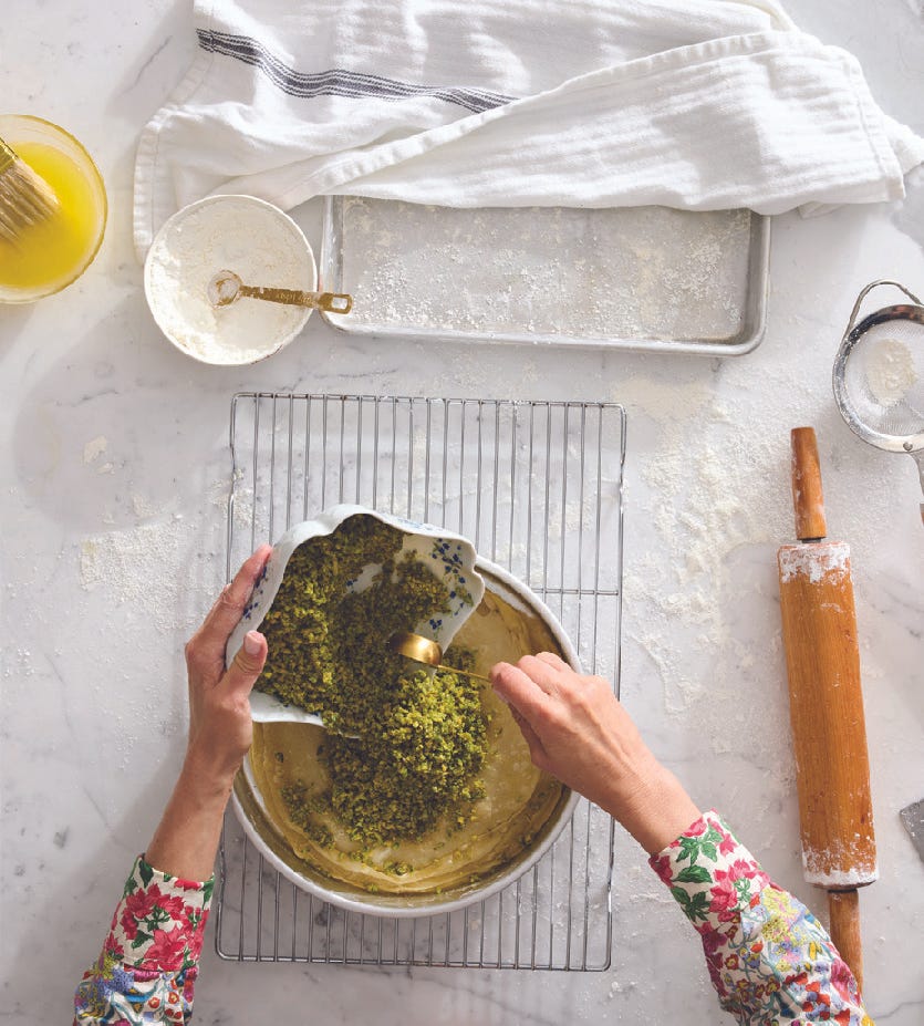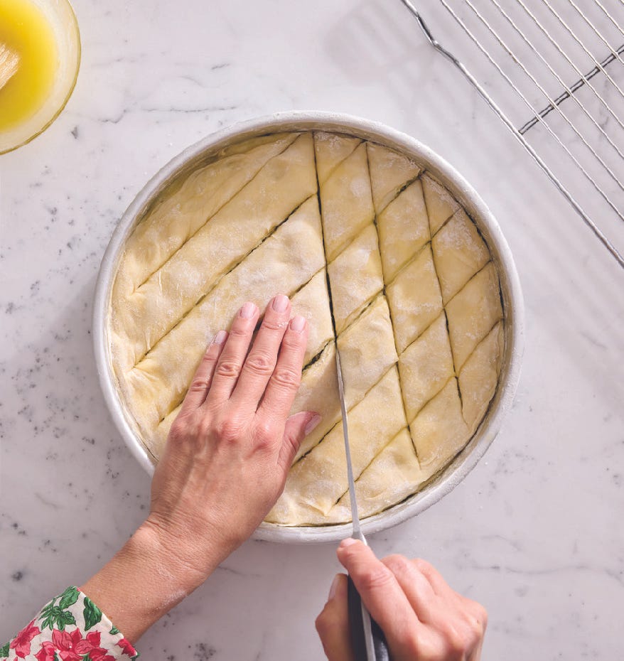 But poring over the pages in Lebanese Baking, Abood’s recipe for Baklava Diamonds jumped out at me, sparking a mixture of hope and desire in my heart. As she writes in the recipe’s hednote, she writes, “My fast and easy method for this ultimate classic doesn’t require buttering every layer, and it still comes out just as light and crisp.” She learned the butter-pour-over method from her great aunt Rita, who had to develop efficiencies to accommodate the quantities of baklava she baked for various celebrations, the holidays, and her own burgeoning baklava side hustle in Lansing. “She made so much she was rendering 50 pounds of butter for her holiday baking,” Abood says.