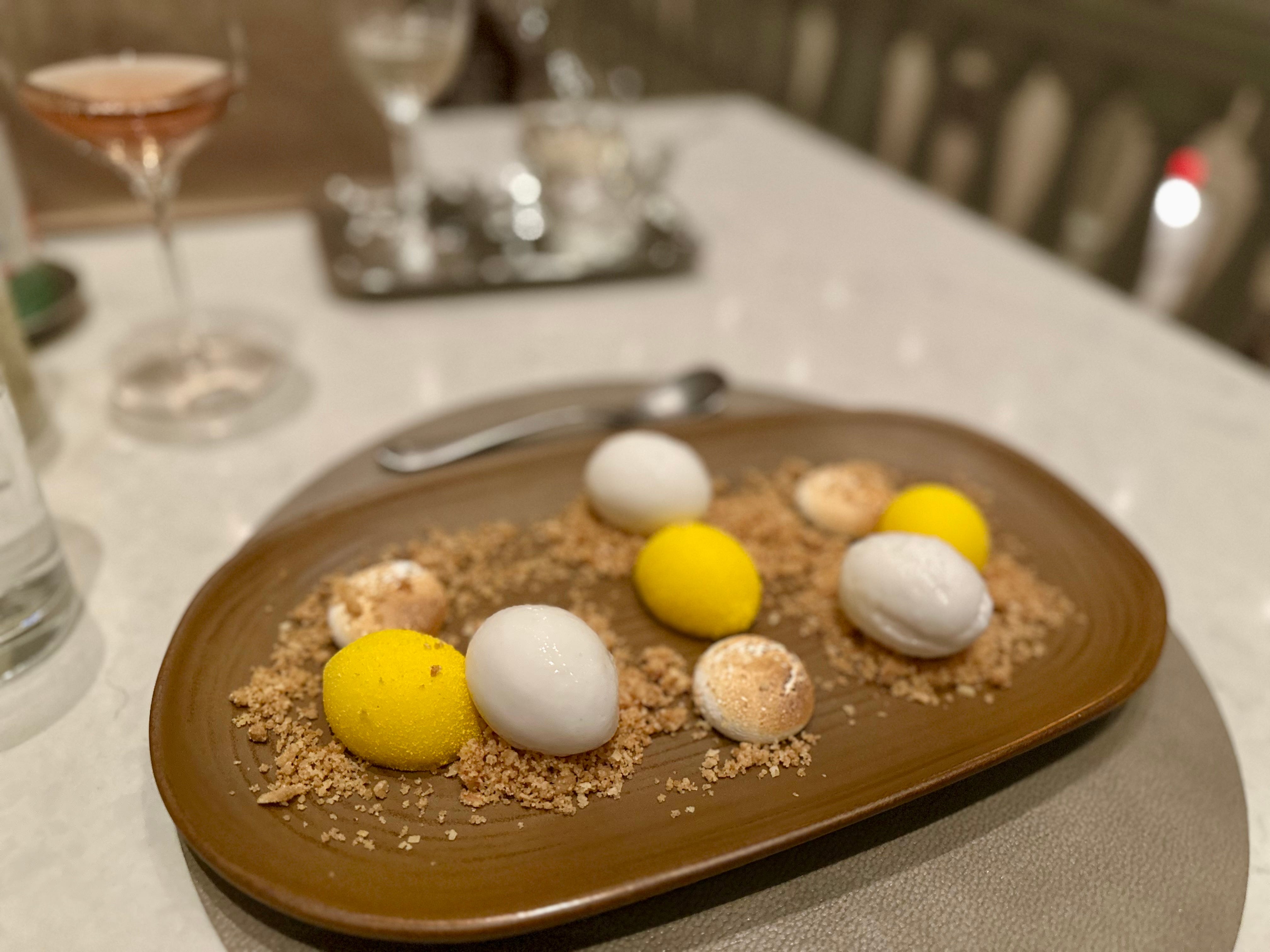 One of the most memorable bites from my recent visit to Frederick, Maryland was in the form of dessert from Wye Oak Tavern, a posh steakhouse the Voltaggio brothers recently opened in The Visitation Hotel. It was a playful, deconstructed take on lemon meringue pie, with perfect spheres of a tart-and-tangy lemon curd set with gelatin, flanked by scoops of coconut sorbet and amply scattered with toasted coconut streusel. Overall, the dessert was light, balanced, and not-too-sweet with plenty of visual and textural intrigue.