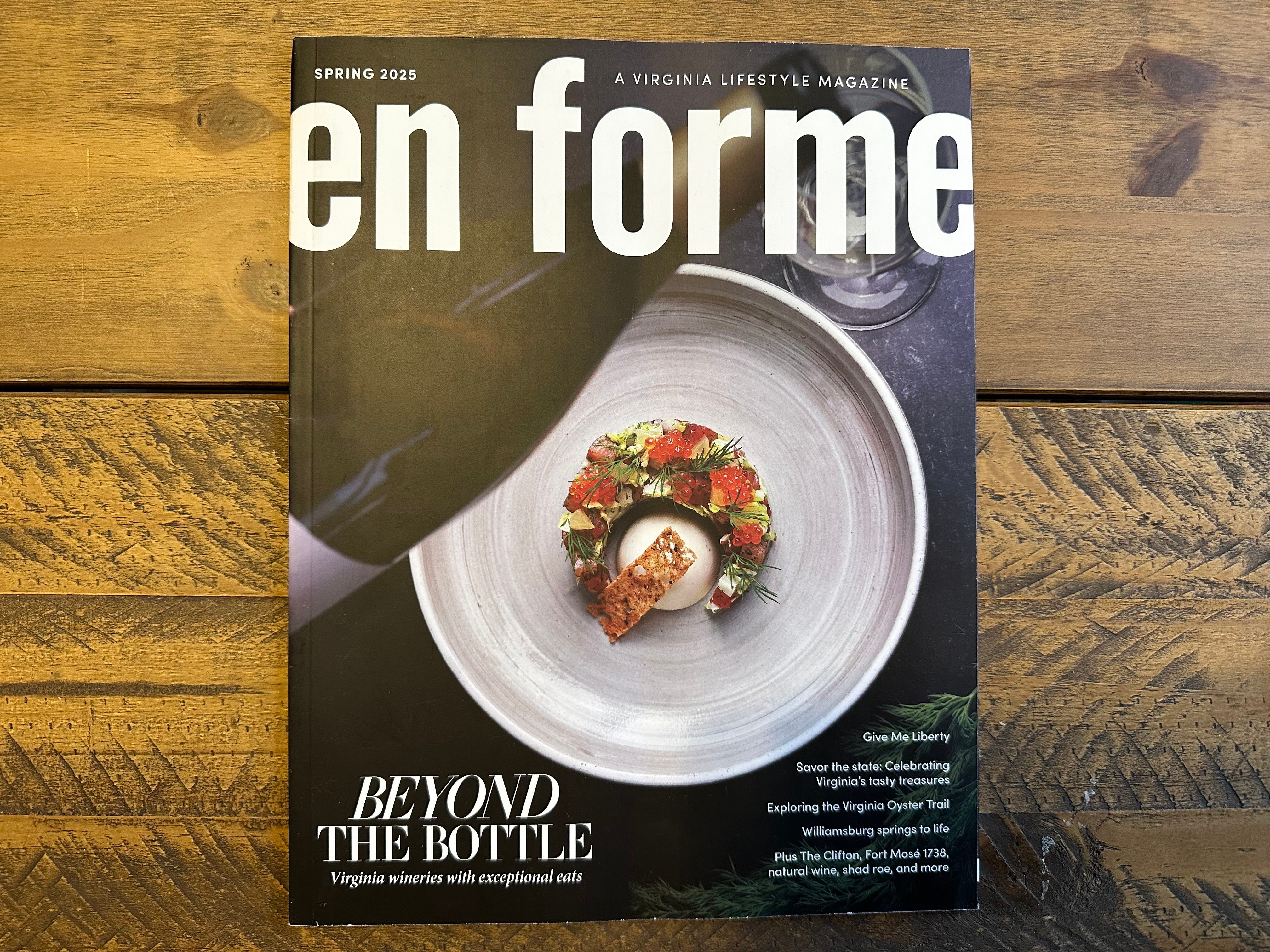 My story about Virginia wineries with exceptional culinary offerings was the cover story of En Forme’s Spring 2025 issue (pictured above). It featured sixteen wineries total, six with a write-up and 10 highlighting perfect pairings, from oysters and mineral-driven whites to craft chocolates and racy reds. Wine is something I’ve yearned to know more about and it was really cool to research how the Virginia wine scene has evolved statewide, especially through the lens of food and the notion of “what grows together, goes together.”