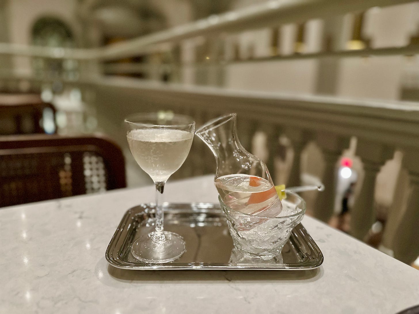Hands down the most delicious cocktail I’ve had the pleasure of sipping so far this year is the Mirepoix Martini from Wye Oak Tavern. There are five martinis to choose from the cocktail menu’s martini service, but I couldn’t resist the most savory and unusual-sounding of the bunch. Among its ingredients, the Mirepoix Martini listed carrot-infused vodka, navy-strength gin, dry vermouth, espelette pepper, and celery bitters. The cocktail had a pleasant vegetable quality with a botanical backbone from the gin, plus a clean, grassy finish. The presentation was gorgeous, complete with a pickled carrot, onion, and celery garnish, and I loved that they served the remaining martini in a glass bottle on its own bed of ice.